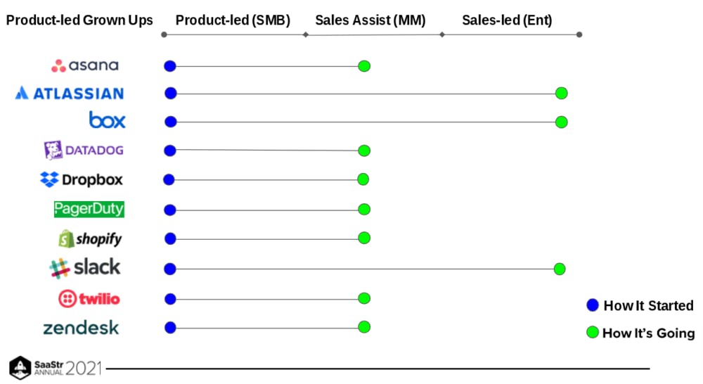 In fact, the software industry is full of success stories about small SaaS companies graduating from an exclusively product-led growth strategy (PLG) to a sales-assisted or sales-led growth motion (SLG). Their customer base shifts from individual users and small teams to larger businesses.