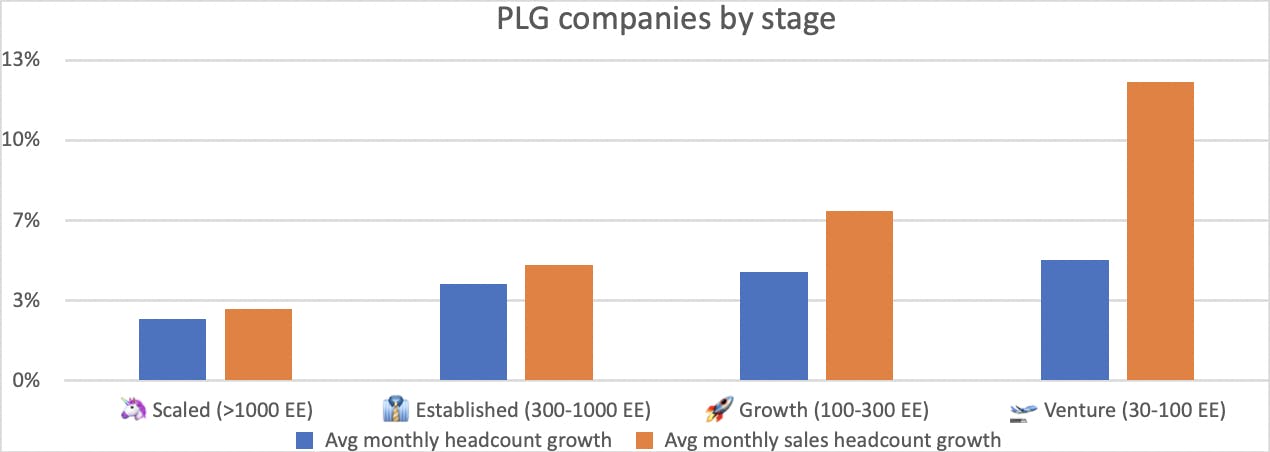 Product-led growth doesn’t mean product-only growth. Most product-led businesses do have some salespeople from early on, with data from peersignal.org showing that PLG startups with fewer than a hundred employees have 8% of their team in sales roles (compared to the B2B average of 14%). But the move upmarket calls for a different level of investment. Those who have achieved enough success to scale beyond 30 people are making clear moves to play catch-up, recruiting 2.5 sales roles for every other increase in headcount.
