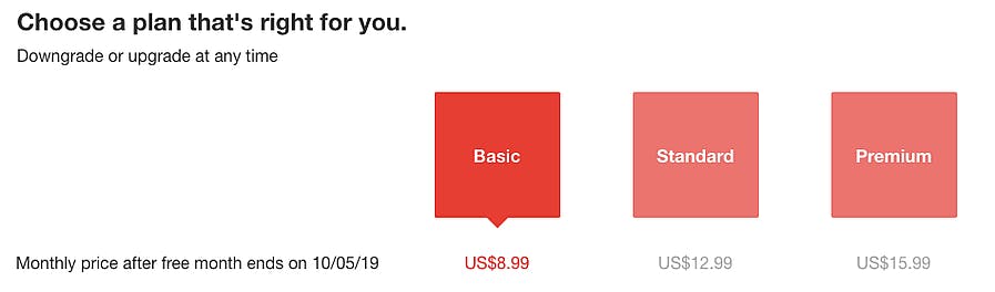 In this example, we'll start off with a customer purchasing Netflix's Basic plan at $8.99 a month. If, after three months, the customer chooses to upgrade to Premium, the monthly price increases to $15.99. From there, our example customer chooses to keep the Premium package for the rest of the year without any signs of downgrading or canceling.